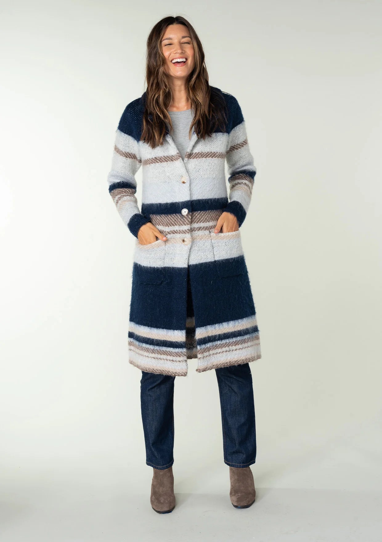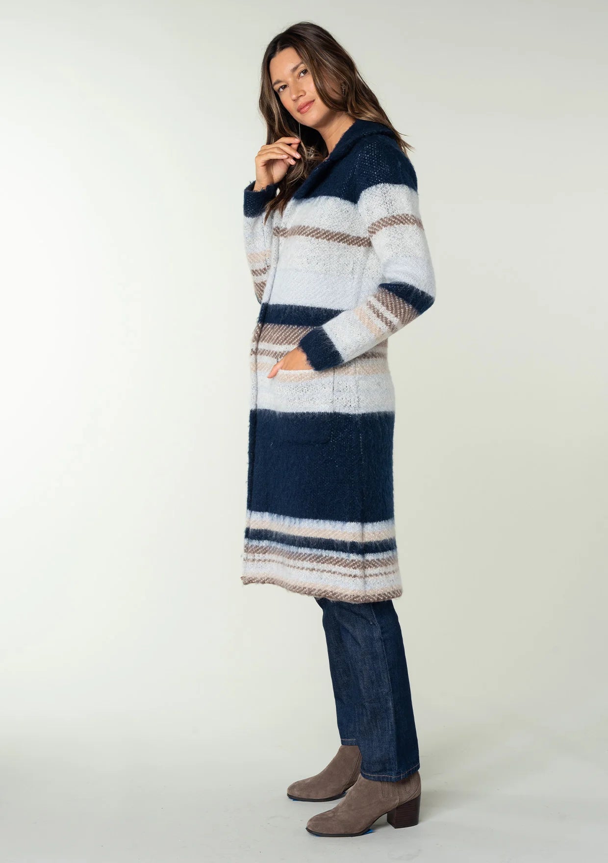 Go ahead and mix business with pleasure with this ultra-soft, striped sweater coat. A cozy style with classic details, like notched... Read more