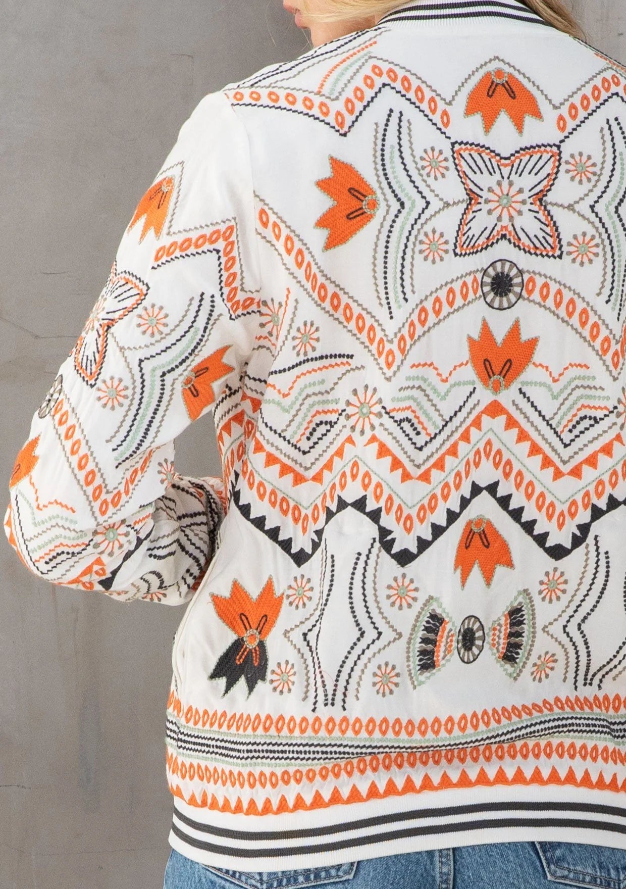 Add a bohemian touch to your outerwear with our embroidered bomber jacket. Featuring a contrast striped collar and wrist cuffs,... Read more