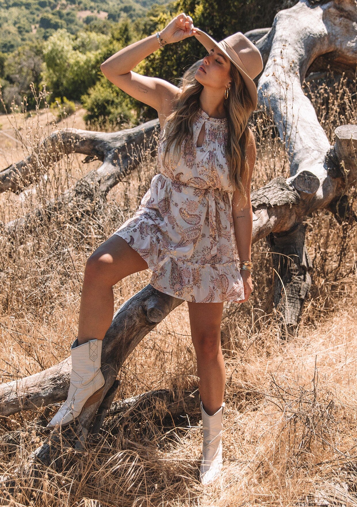 A sleeveless fall mini dress in a dusty rose paisley print, with light-catching gold metallic detail. Paisley print Gold metallic detail... Read more