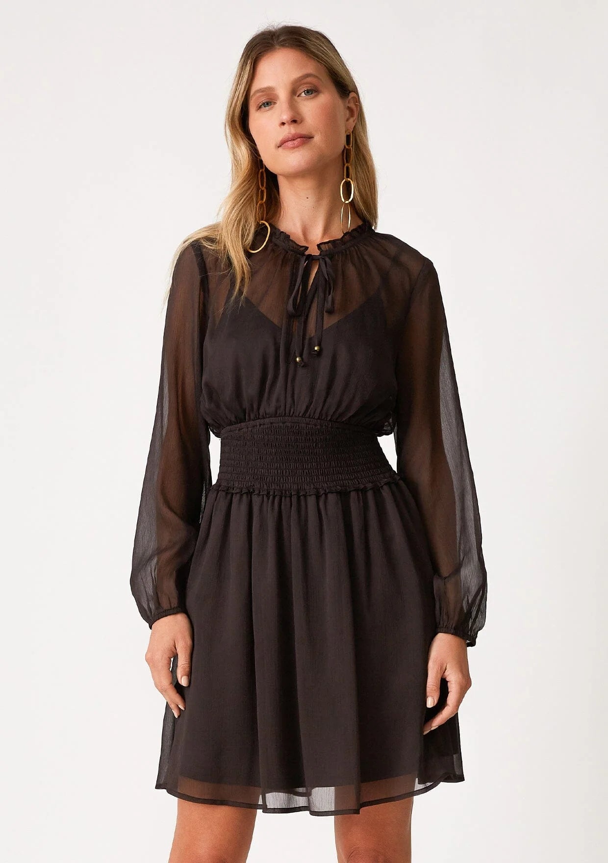 A fall boho mini dress designed in a sheer dark brown chiffon. Chiffon Relaxed fit Voluminous sheer long sleeves Elastic wrist... Read more