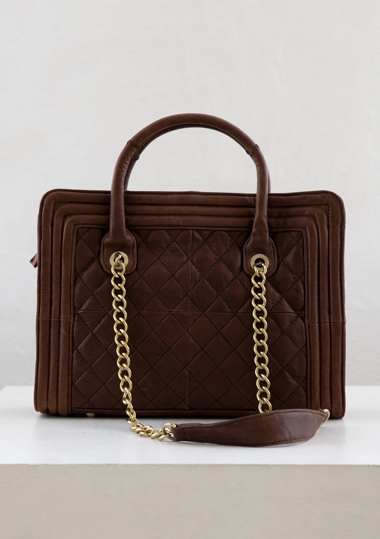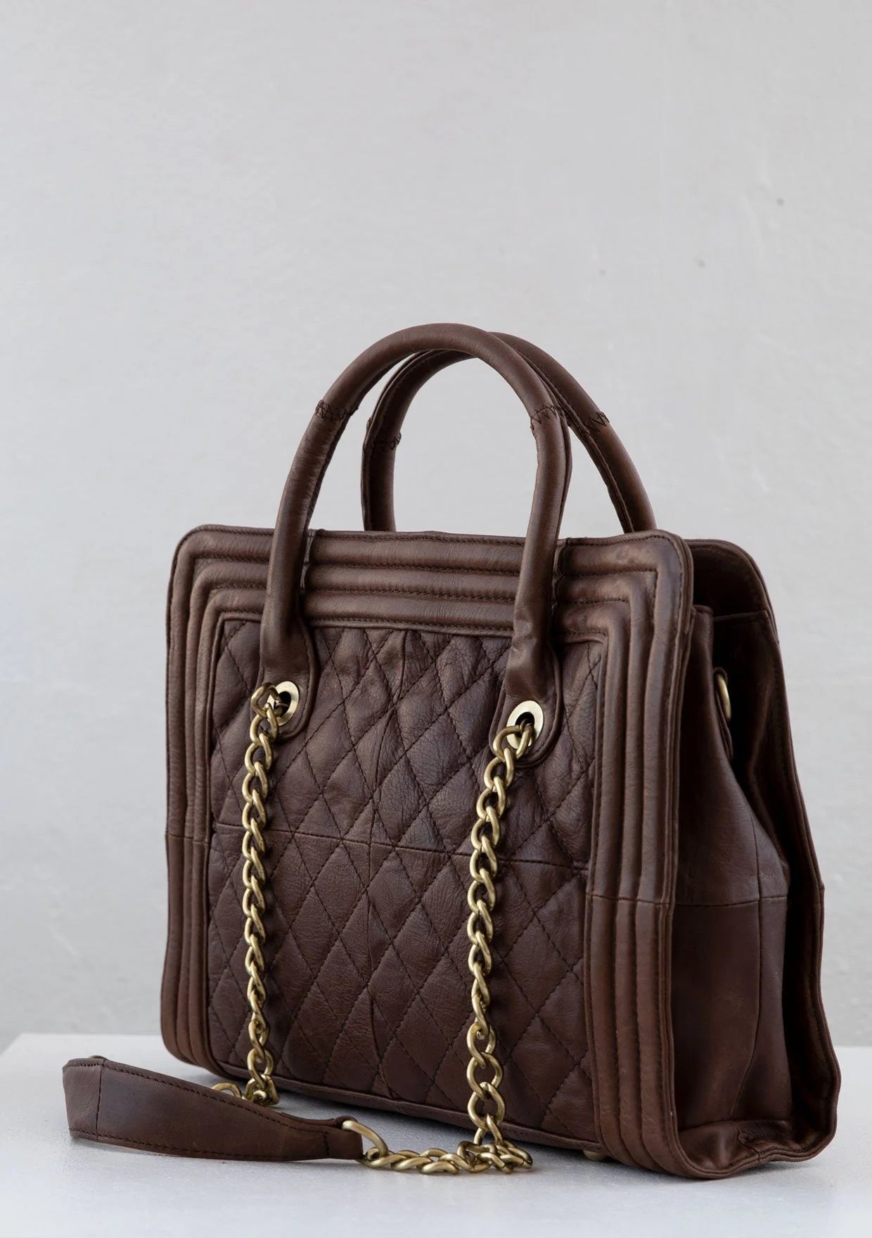 A timeless style made from luxuriously soft leather, our quilted leather purse features top leather handles and chain shoulder straps.... Read more