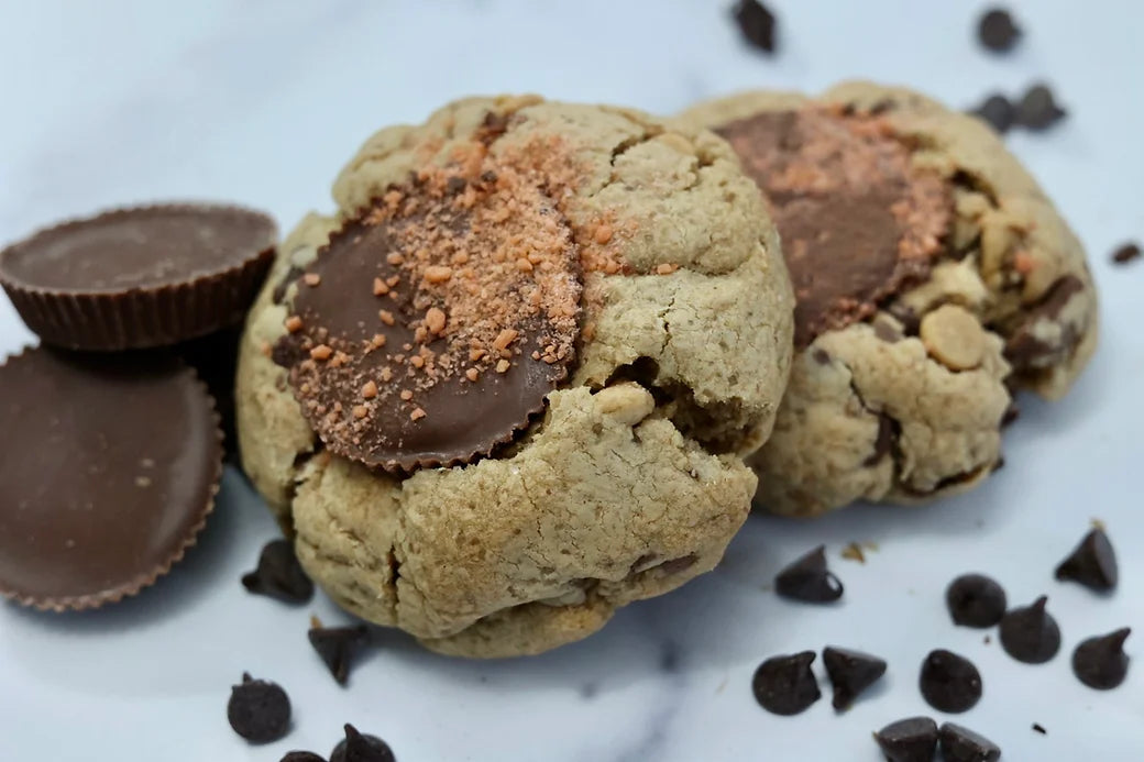 Get ready for a cookie experience like no other with our Peanut Butter Cookie with Reese's Cup, Peanut Butter Chips, Milk Chocolate chips, and Peanut Butter Chocolate Crumbles!