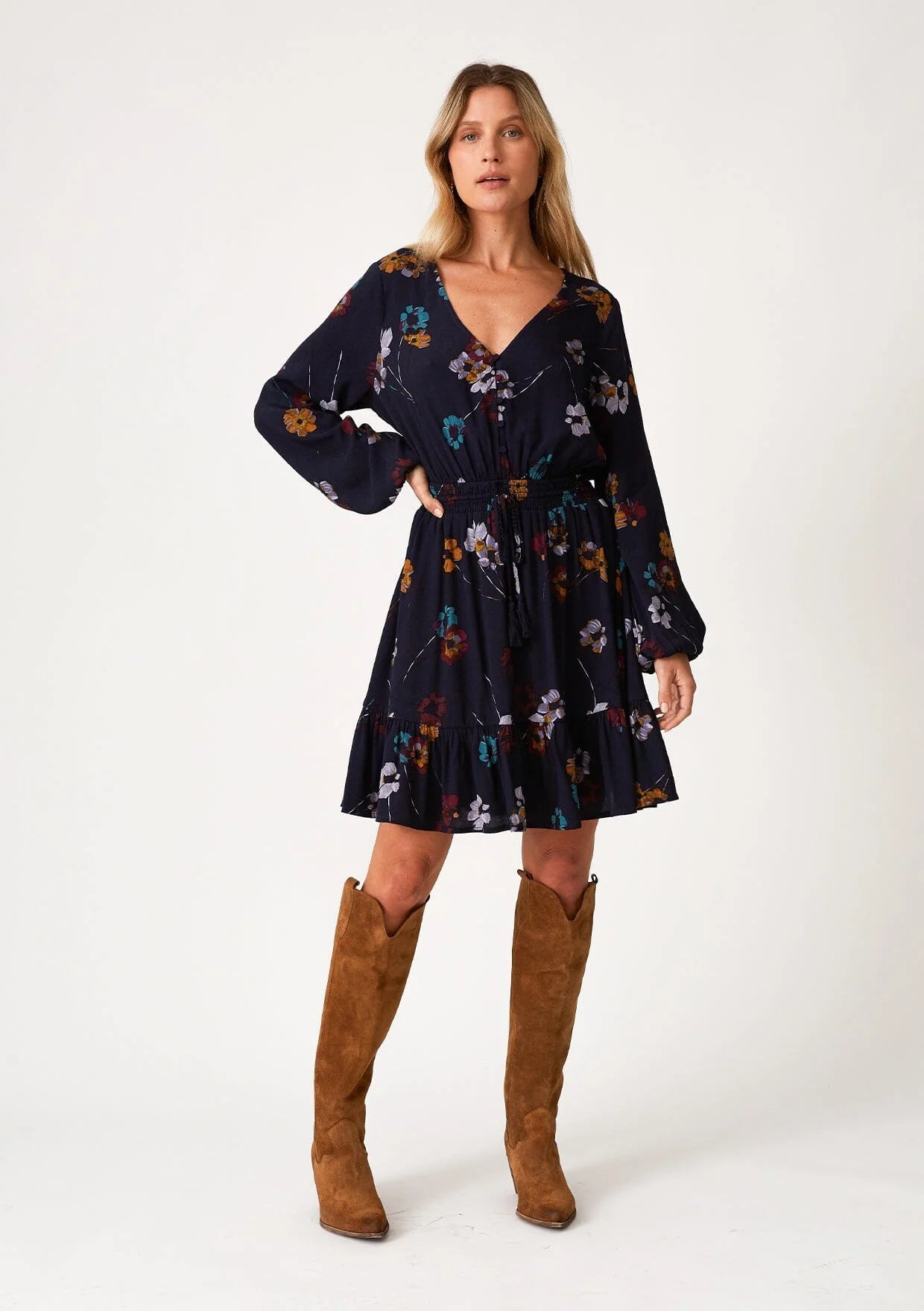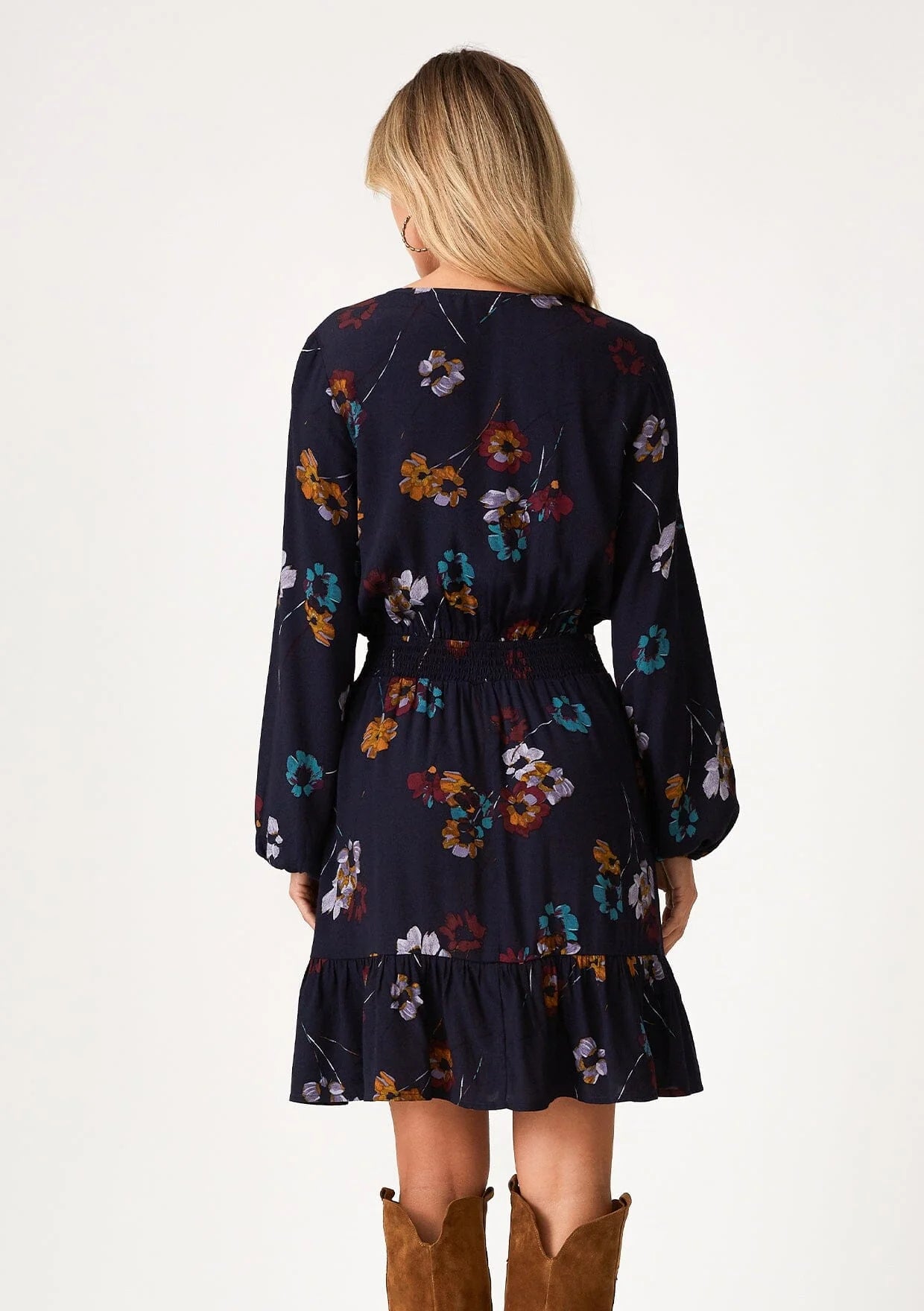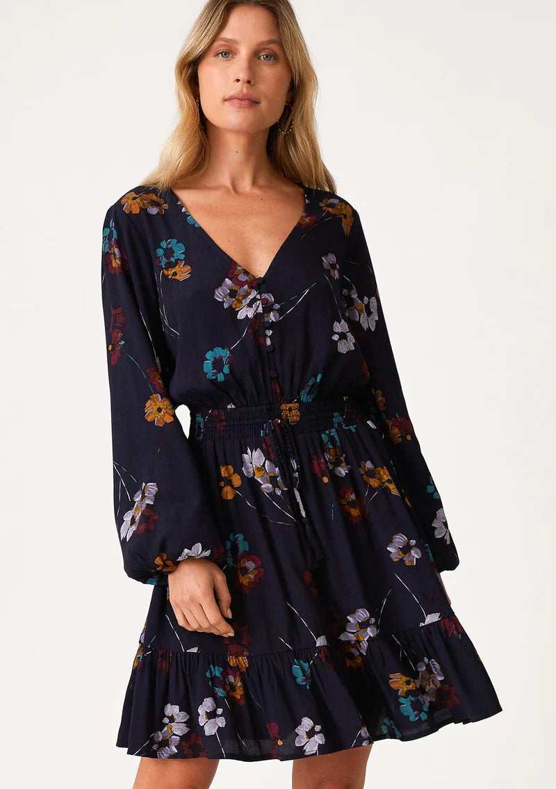A classic fall bohemian mini dress in a blue floral print. Floral print Relaxed fit Long volume sleeve Elastic wrist cuff Mini... Read more