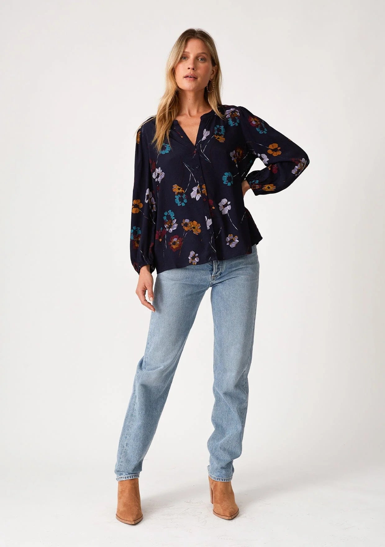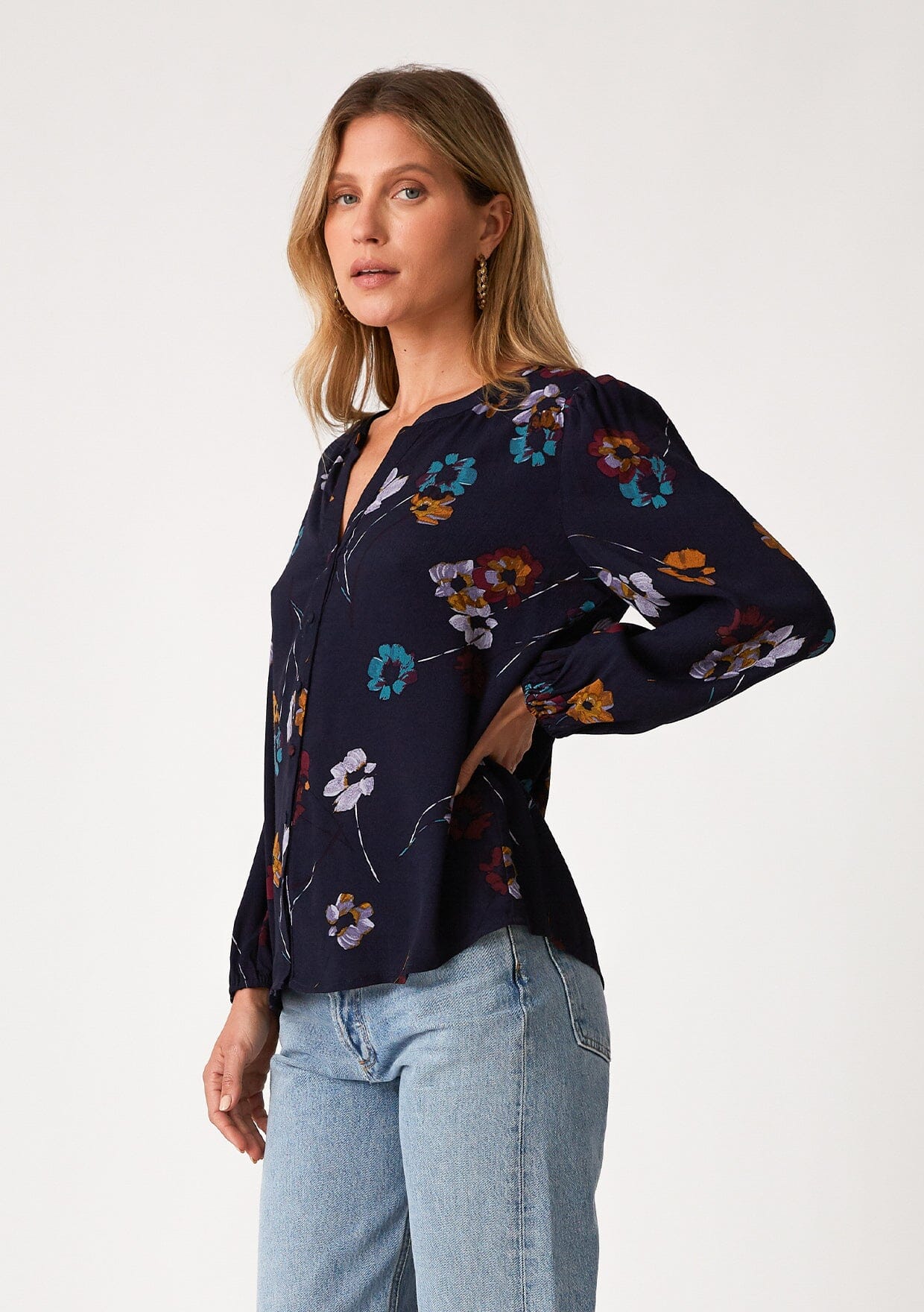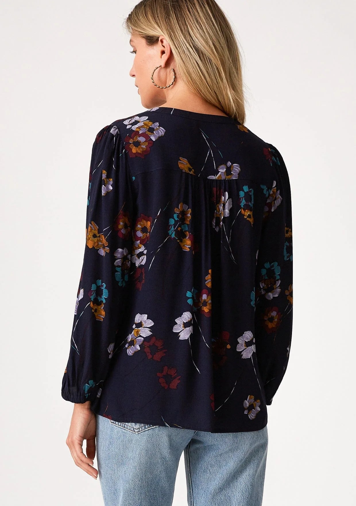 A classic long sleeve button-front bohemian blouse in a blue floral print. Floral print Relaxed fit Long sleeve Elastic wrist cuff Split... Read more